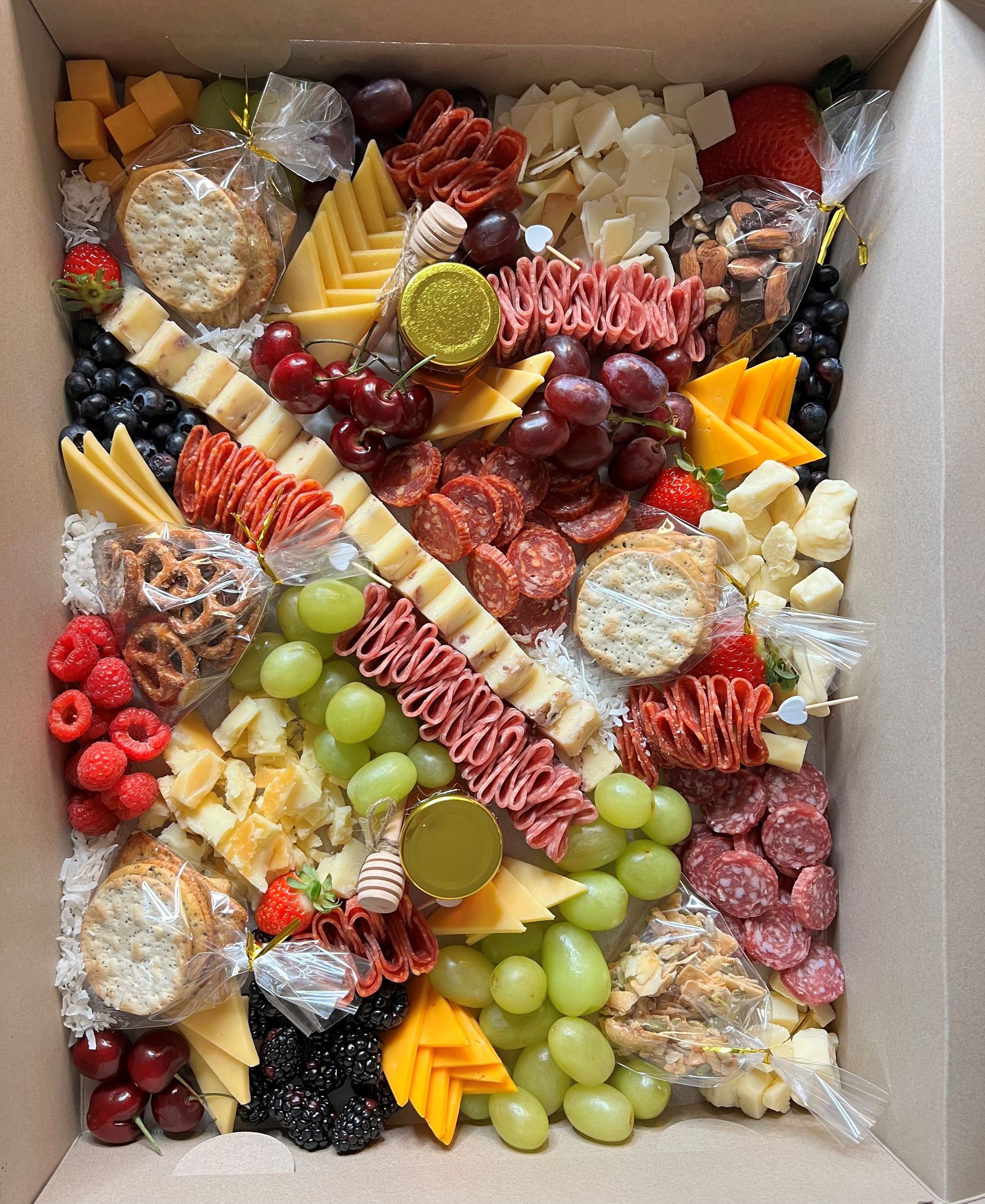 Our charcuterie letters and boxes are delectable offerings perfect for showers, birthdays, parties, home closings, weddings, corporate events, gifts, and more. These medium-sized boards serve 12-15 individuals and are ideal as a centerpiece for your gathering or as the main dish for brunches and special celebrations. Each letter or box is filled with: